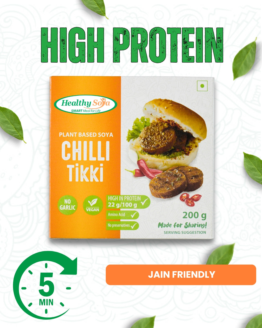 Spicy, protein-packed and Jain-friendly, our Chili Tikki is made from plant-based soy, delivering a bold bite with clean ingredients. Perfect for guilt-free snacking or a quick meal!